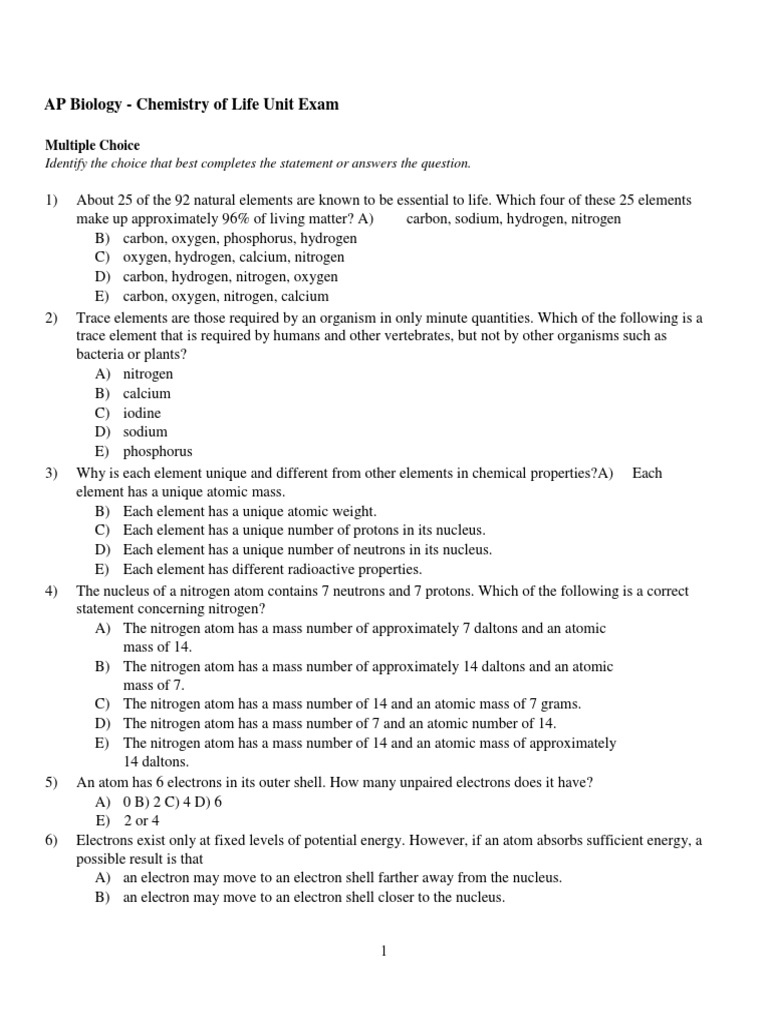Examview 2011 2012 Ap Chemistry Of Life Unit Exam Ap Biology